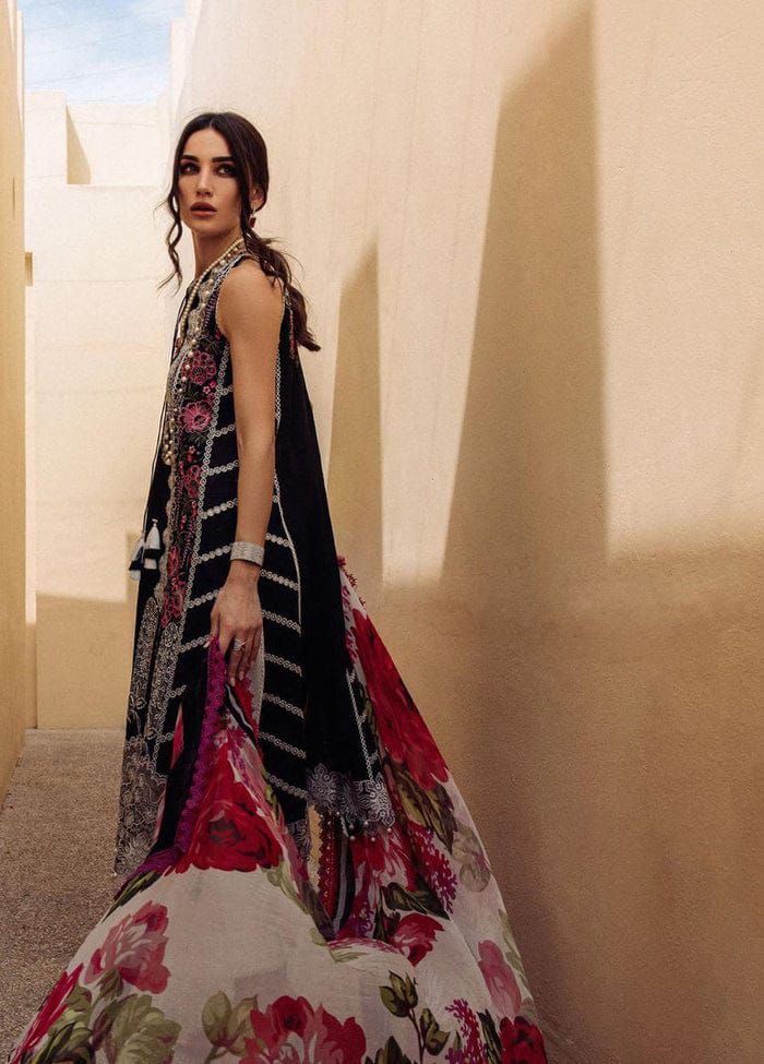 3-piece embroidered suit in rich black, featuring intricate white thread embroidery, cutwork, and floral motifs. Comes with a Silk Digital Printed Dupatta, embroidered front & back panels, embroidered daman, and embroidered trouser patch. A stylish blend of classic and contemporary – perfect for festive or semi-formal wear.