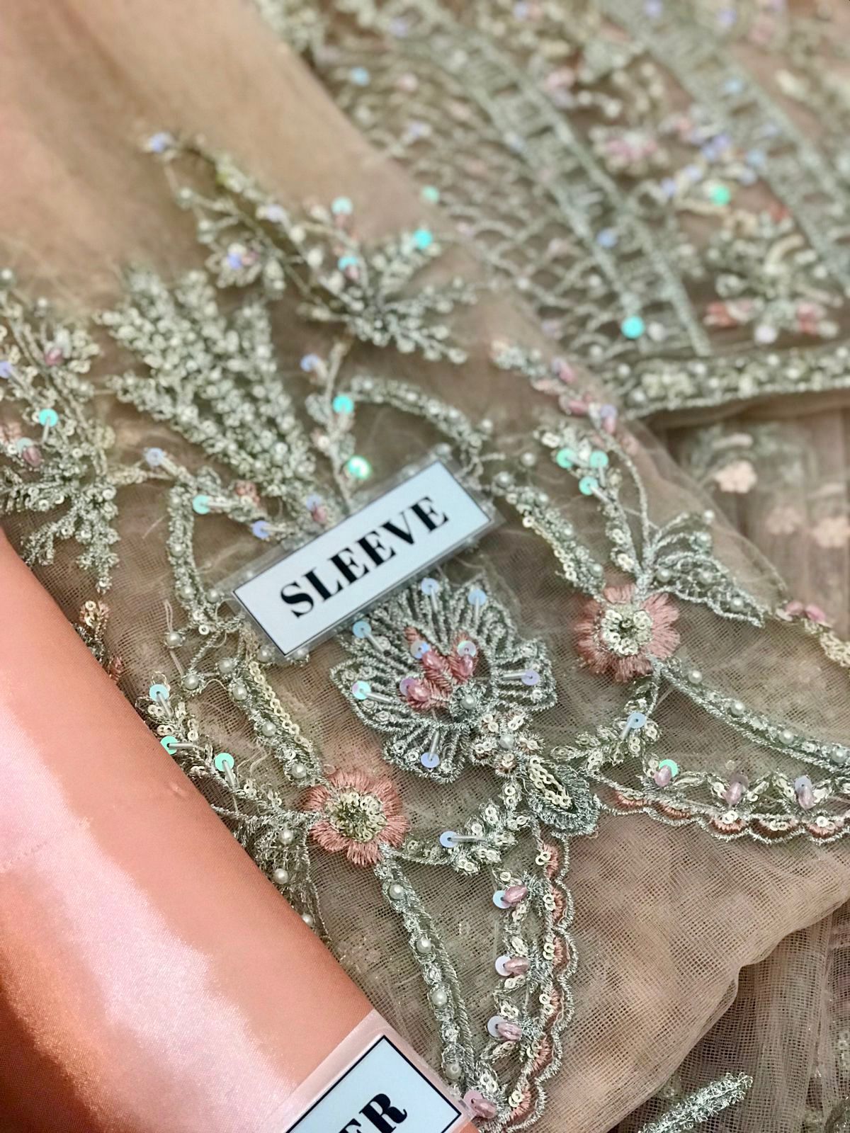 Front: Fully embroidered with detailed sequin work, accented with hand-stitched pearls, following the original premium pattern.