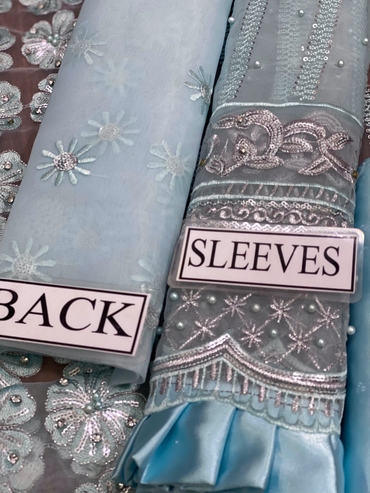 Shirt: Crafted from premium blue organza, the front is beautifully embroidered with delicate sequin and stone work, adding a touch of sparkle and elegance.