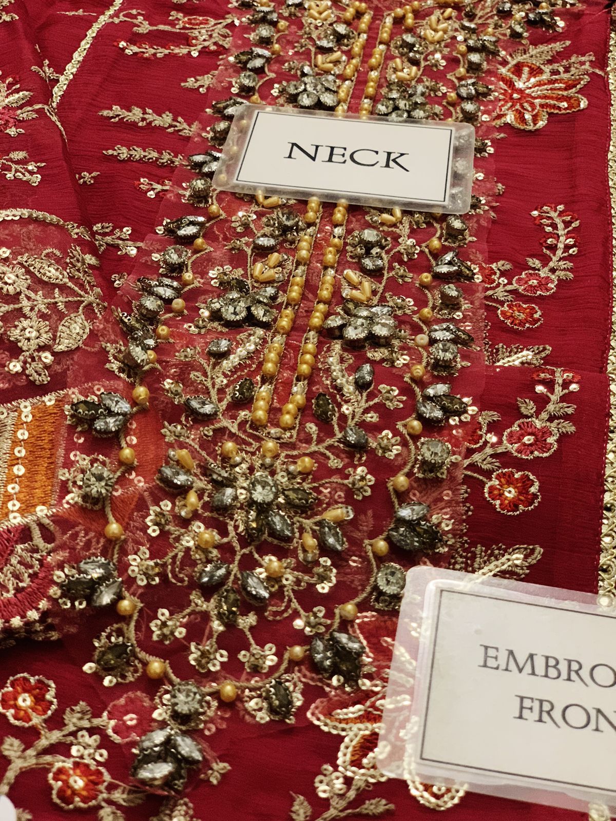 Sleeves: Chiffon, fully embroidered with sequin work and matching embroidered borders.